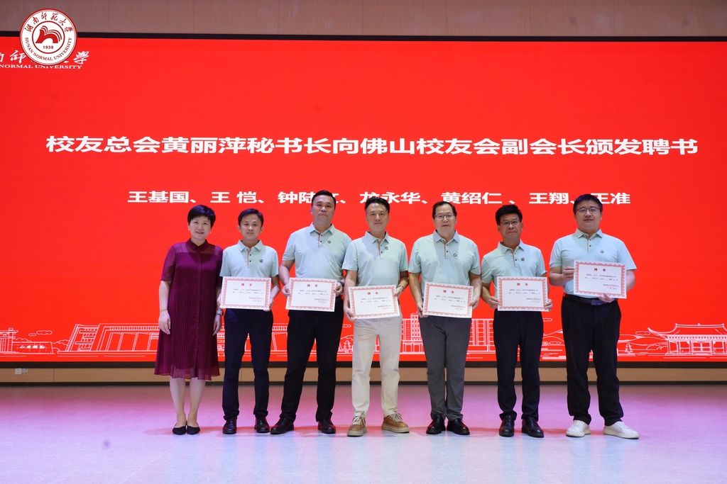 王輝向新當選會長授會旗,并向名譽會長、會長頒發了聘書。他表示,校友是大學的品牌與底氣,也是推動學校發展的重要力量,母校與校友是天然的情感共同體、命運共同體;希望佛山校友會在周展鵬會長的帶領下,成為連接母校與校友的橋梁,進一步加強校友之間的聯系,促進資源共享和合作共贏。