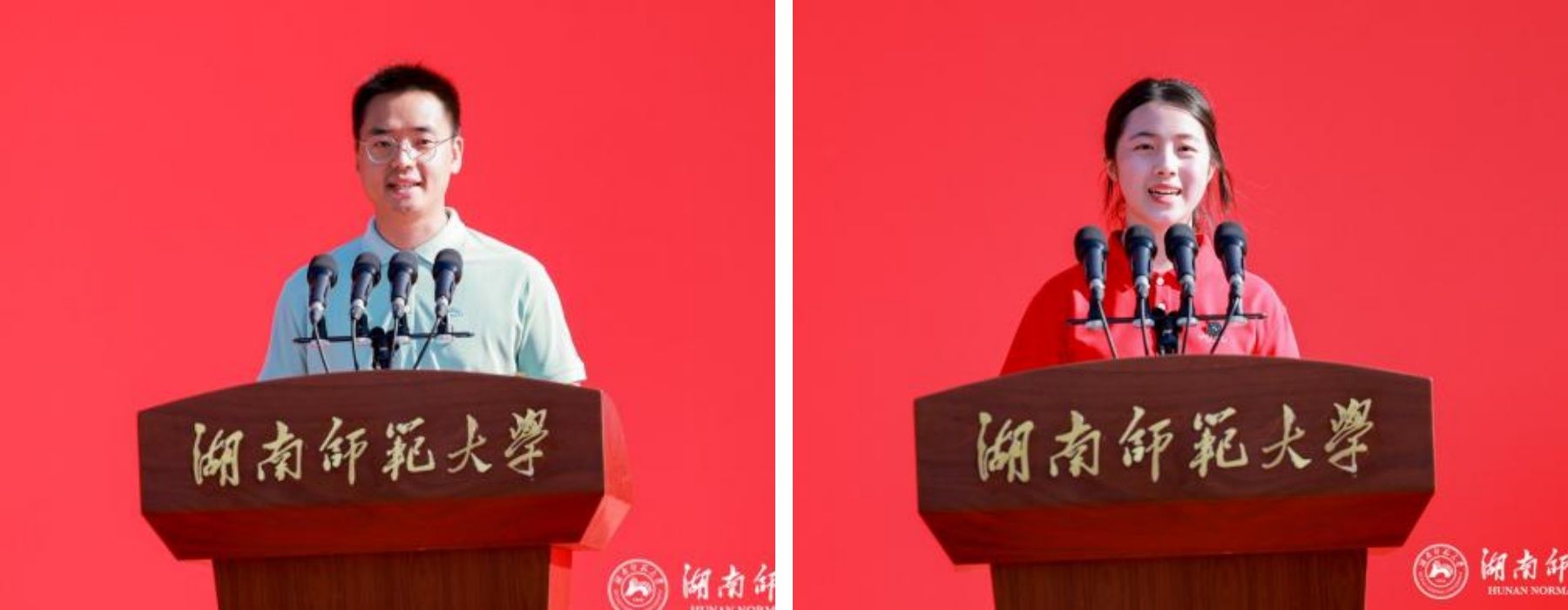 2025年湖南省最美教師、馬克思主義學院教授鄧驗作為教師代表發言。她回顧緣系師大的14年成長路,鼓勵同學們以理想為燈照亮前路、以創新為翼搏擊長空、以堅韌為盾直面挑戰、以團結為橋連接未來,奮力奔跑、勇敢逐夢,成長為有理想、敢擔當、能吃苦、肯奮斗的新時代好青年!