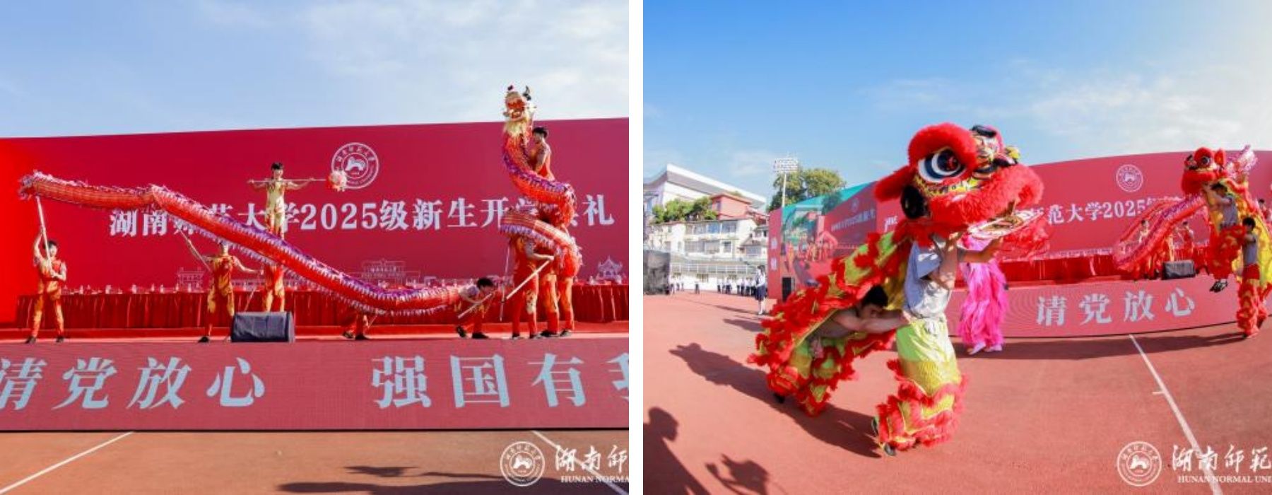 典禮開始前,體育學院和音樂學院的學生代表獻上了《第一天》《篇章》《光芒》《祥龍瑞獅迎驕子》等精彩節目,以青春歌舞和傳統瑞獅迎接新生入學,現場氣氛熱烈昂揚。