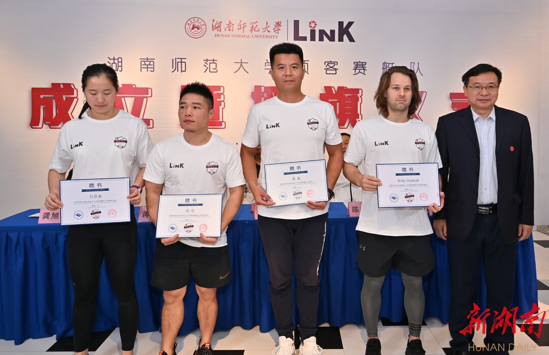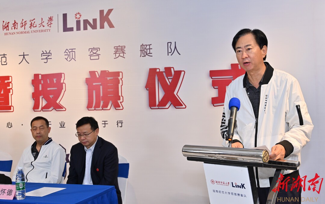 儀式現場,龔旭紅將隊旗授予湖南師范大學體育學院院長湯長發,湖南師范大學副校長劉懷德為賽艇隊的教練團隊頒發聘書,舉重奧運冠軍龍清泉被聘為“榮譽舵手”。