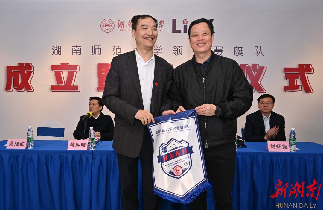 成立儀式現(xiàn)場,省體育局副局長龔旭紅將隊旗授予湖南師范大學體育學院院長湯長發(fā),湖南師范大學副校長劉懷德為賽艇隊的教練團隊頒發(fā)聘書,舉重奧運冠軍龍清泉被聘為“榮譽舵手”。