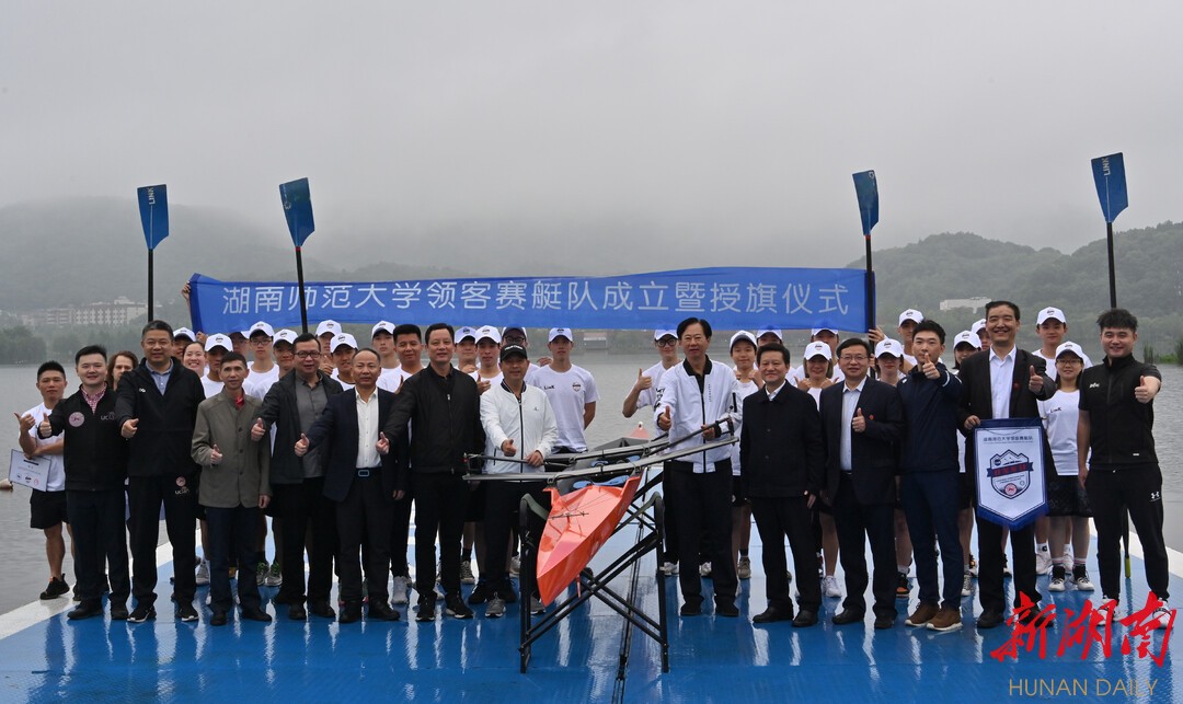 新湖南客戶端5月22日訊(記者 蔡矜宜 胡旻)今天上午,湖南首支高校賽艇隊——湖南師范大學領客賽艇隊,在西湖公園的領客水上運動基地正式成立并進行授旗。
