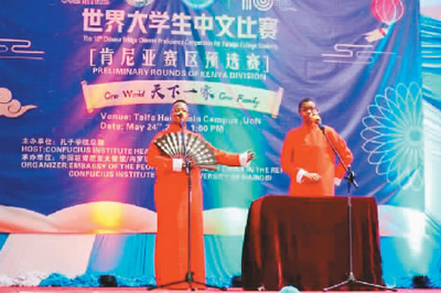 費藝思(左)和搭檔參加“漢語橋”世界大學生中文比賽肯尼亞賽區預選賽。 |