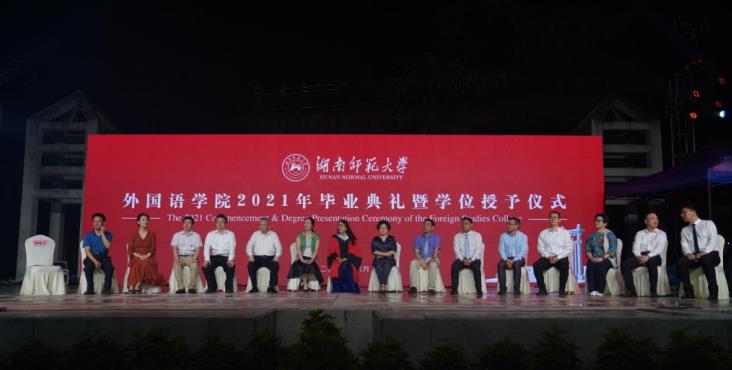 6月17日晚,湖南師范大學外國語學院在騰龍樓廣場舉行2021年畢業典禮暨學位授予儀式,歡慶2021屆畢業生圓滿完成學業,踏上新的人生征程。校友代表、外國語學院1988屆英語專業校友、長沙青竹湖湘一外國語學校黨委書記、副校長吳武夫,湖南師范大學校友總會、教育基金會秘書長楊玲及全體院領導、教授代表等出席典禮。