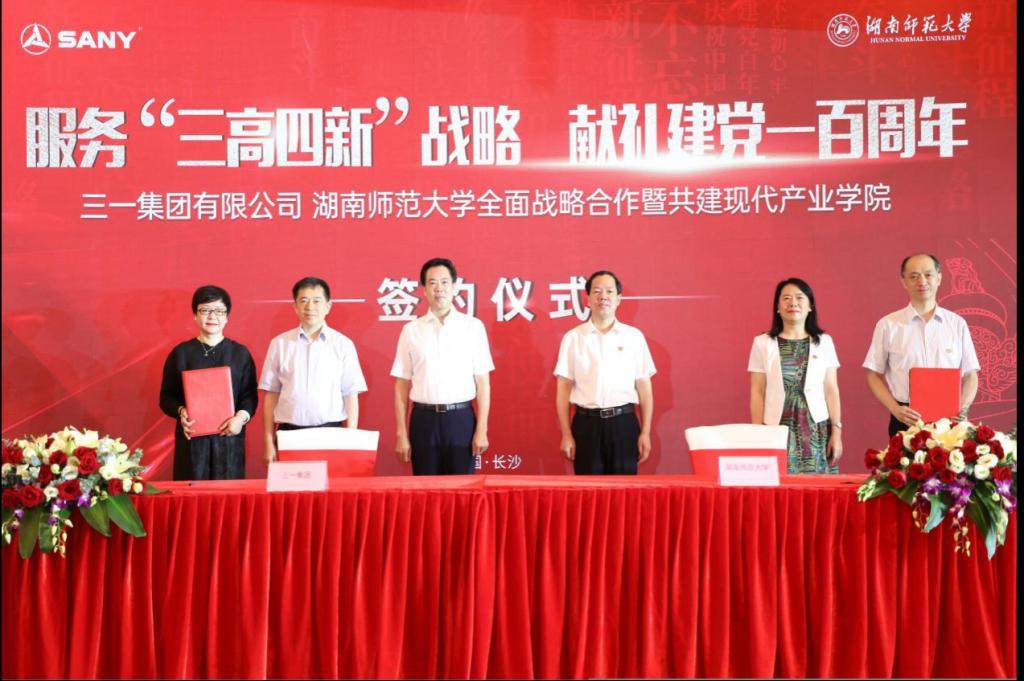 湖南師范大學與三一集團均發源于漣源,有著深厚的合作基礎和良好的合作前景。雙方于2020年10月開啟教育辦學合作,共建了“三一鄉村教育研究院”,直接服務國家鄉村振興戰略。雙方此次全面升級戰略合作,同時為響應我省“三高四新”戰略,雙方特別簽訂了共建“三一現代產業學院”協議,由三一集團出資2000萬元,瞄準“三高四新”戰略重點,在我校湖南師范大學掛牌成立一所融人才培養、師資建設、科學研究、理論創新于一體的產業學院,以實際行動為服務我省“三高四新”戰略,特別是助力打造“國家重要先進制造業高地”提供“三一方案”和“師大智慧”。