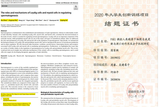 中國試管嬰兒案例穩居不下,驅使著生殖干細胞研究的發展。懷著對新生命的敬畏及順應時代發展的需求,該院何祖平教授指導的大學生團隊依托“人類生殖健康新技術”產學研合作示范基地,聚焦PAK1調控人類精原干細胞自我更新與凋亡的作用及分子機制研究,榮獲2019年國家級大學生創新創業訓練計劃項目,已順利結題;臨床醫學專業本科生分別以第一作者和并列第一作者身份在《Cellular and Molecular Life Sciences》(IF:9.261)發表高水平科研論文。