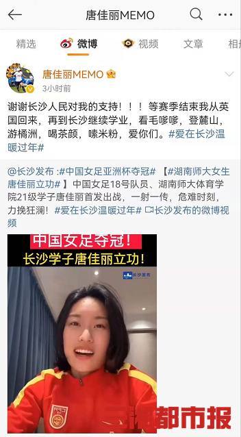 三湘都市報2月7日訊(全媒體記者 楊斯涵 黃京 余蓉 通訊員 董飛)“謝謝長沙人民對我的支持!等賽季結束我從英國回來,再到長沙繼續學業。”今日,中國女足18號隊員唐佳麗在微博上透露自己的奪冠心愿,表示想回長沙好好完成學業,還要登麓山、游橘洲、喝茶顏、嗦米粉……