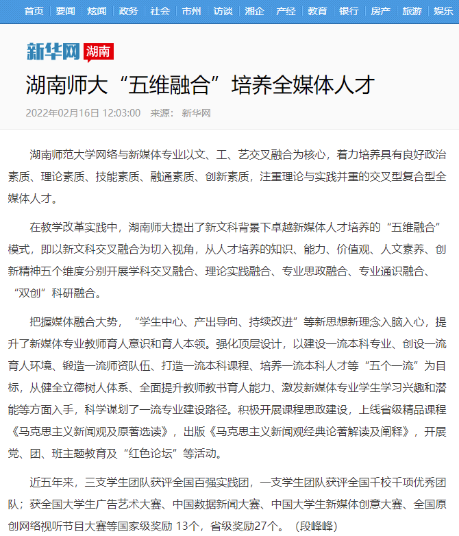 新華網:《湖南師大“五維融合”培養全媒體人才》