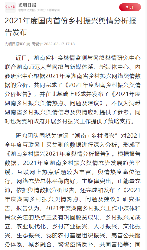 光明日報:《2021年度國內首份鄉村振興輿情分析報告發布》