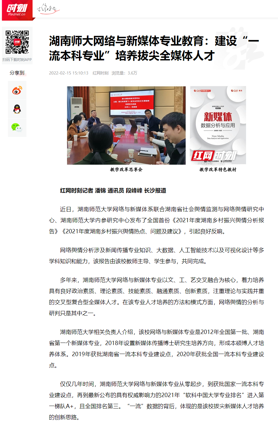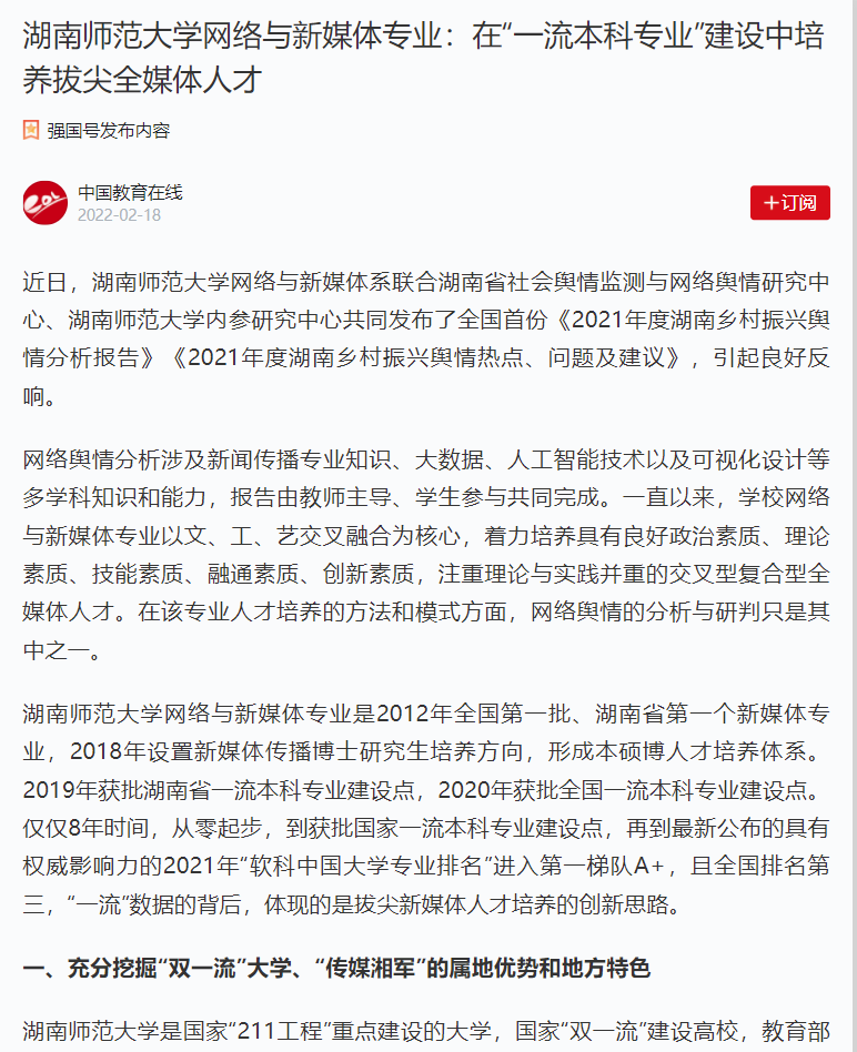 中國教育在線、學習強國:《湖南師范大學網絡與新媒體專業:在“一流本科專業”建設中培養拔尖全媒體人才》