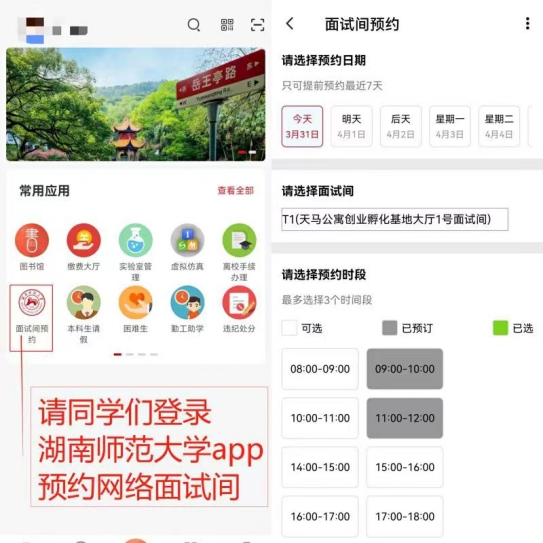 1.下載并打開(kāi)“湖南師范大學(xué)”APP,單擊“面試間預(yù)約”,根據(jù)相關(guān)提示選擇相應(yīng)面試間申請(qǐng)。原則上應(yīng)至少提前1天申請(qǐng),不得跨宿舍區(qū)申請(qǐng),每位同學(xué)最多可申請(qǐng)連續(xù)三個(gè)時(shí)間段。