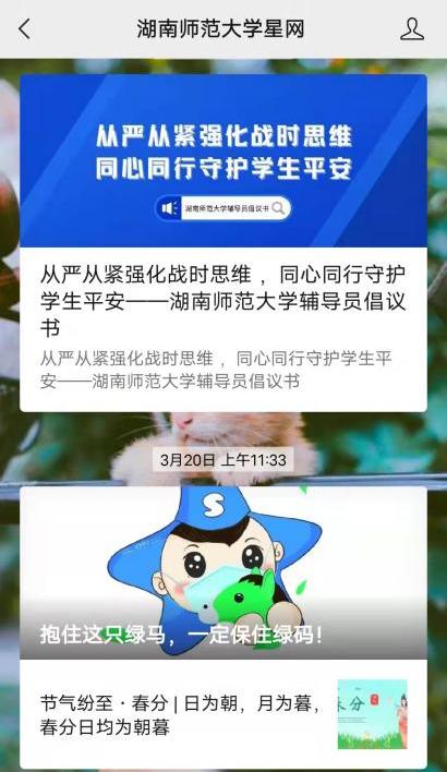 加強(qiáng)學(xué)生思想引領(lǐng),充分做好疫情防控宣傳工作。通過湖南師范大學(xué)星網(wǎng)、湖師小團(tuán)子等平臺,及時(shí)發(fā)布《湖南師范大學(xué)輔導(dǎo)員倡議書》、“疫情防控rap”“湖師大春季在校防疫指南”,推出“星夜讀”等防疫專題欄目,深入挖掘奮戰(zhàn)在抗疫一線的輔導(dǎo)員事跡,廣泛宣傳報(bào)道,引導(dǎo)廣大師生堅(jiān)定必勝信心、科學(xué)自我防護(hù),共同戰(zhàn)勝此次疫情防控斗爭。