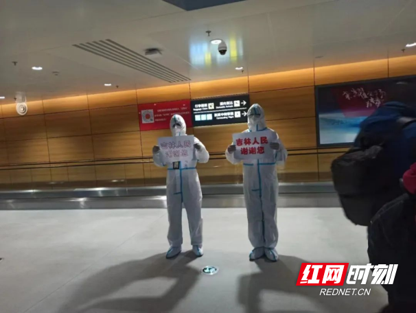 3個多小時的飛行,我們順利抵達吉林長春龍嘉國際機場。出機場時,我看到遠處有兩個“大白”,手舉著標語“從前抗日有湘軍,如今抗疫贊湘軍”“吉林人民謝謝您”時,身為一名護士,激動的淚水在我的眼睛里打轉。