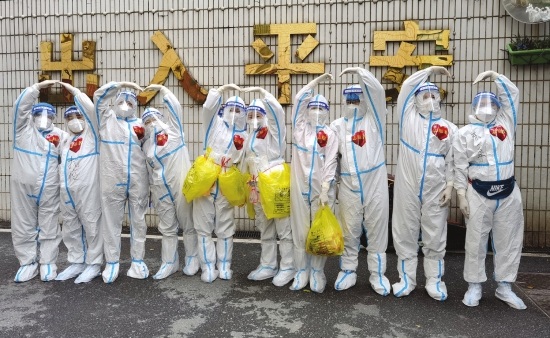 董潔(左四)和隊員在電信小區門口合影,后面是四個大字:出入平安。隊員身上黃色的袋子,一邊裝工具一邊裝垃圾,方便好用。 組圖/受訪者提供