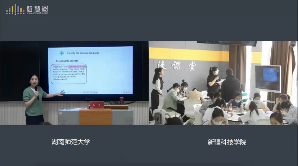 湖南師范大學青年教學能手、全國高校外語課程思政教學比賽特等獎獲得者王蘭老師在外國語學院智慧教室,通過智慧樹網的直播互動平臺,與新疆科技學院400余名學子的《大學英語二》課堂云同步,利用智慧樹網的課堂工具,實現兩地點名、投票、答疑等教學環節。整堂課程呈現流暢,學生互動積極,王蘭老師嚴謹的教學態度、精巧的教學設計、親和的教學表現得到了兩校學子的肯定與喜愛。