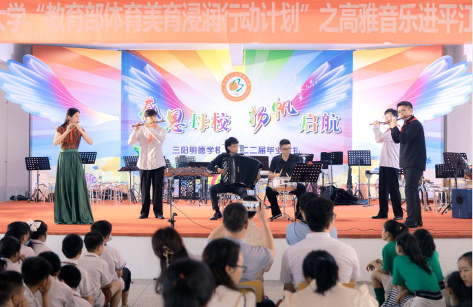 6月10日,湖南師范大學“教育部體育美育浸潤行動計劃”之高雅音樂進校園民族音樂會在平江三陽明德學校大禮堂上演。