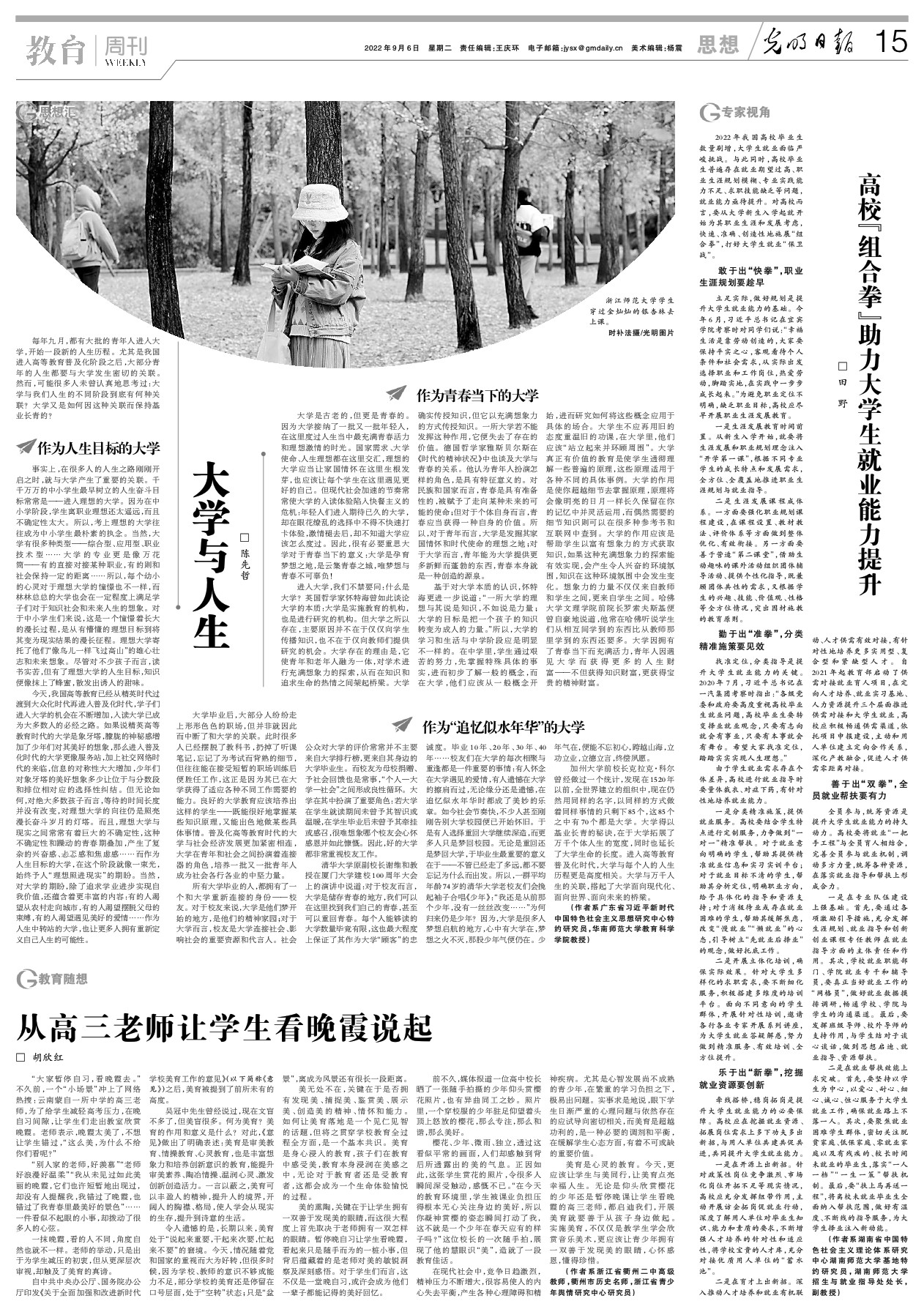 2022年我國高校畢業生數量劇增,大學生就業面臨嚴峻挑戰。與此同時,高校畢業生普遍存在就業期望過高、職業生涯規劃模糊、專業實踐能力不足、求職技能缺乏等問題,就業能力亟待提升。對高校而言,要從大學新生入學起就開始為其職業生涯和發展考慮,快速、準確、創造性地施展“組合拳”,打好大學生就業“保衛戰”。