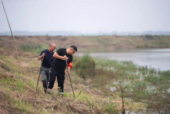 兩名鄉鎮干部在巡堤 陳思汗 攝