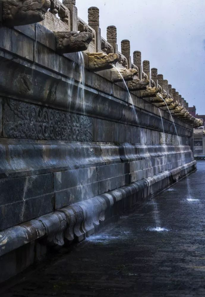 雨落時,我剛好走到了弘義閣(太和殿西廡正中之閣),站立在廊檐下,看雨點實實在在地敲打在冰冷的臺基上,又通過臺基四周和螭首,變成無數條弧度相等的水線,帶著森然的回響,涌進臺基下的排水渠。那是一次陣容龐大的合唱,演員是宮殿里的一千多只螭首,平時它們守在臺基邊緣的望柱下,一言不發,一到雨時,就都活躍起來,眾聲喧嘩,讓人相信,龍(螭是傳說中一種沒有角的龍)這一物種,真的遇水而活。