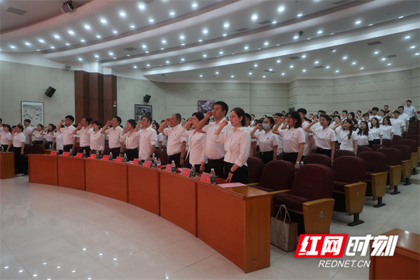 王輝帶領全體畢業生黨員重溫入黨誓詞,青年學子許下錚錚誓言。