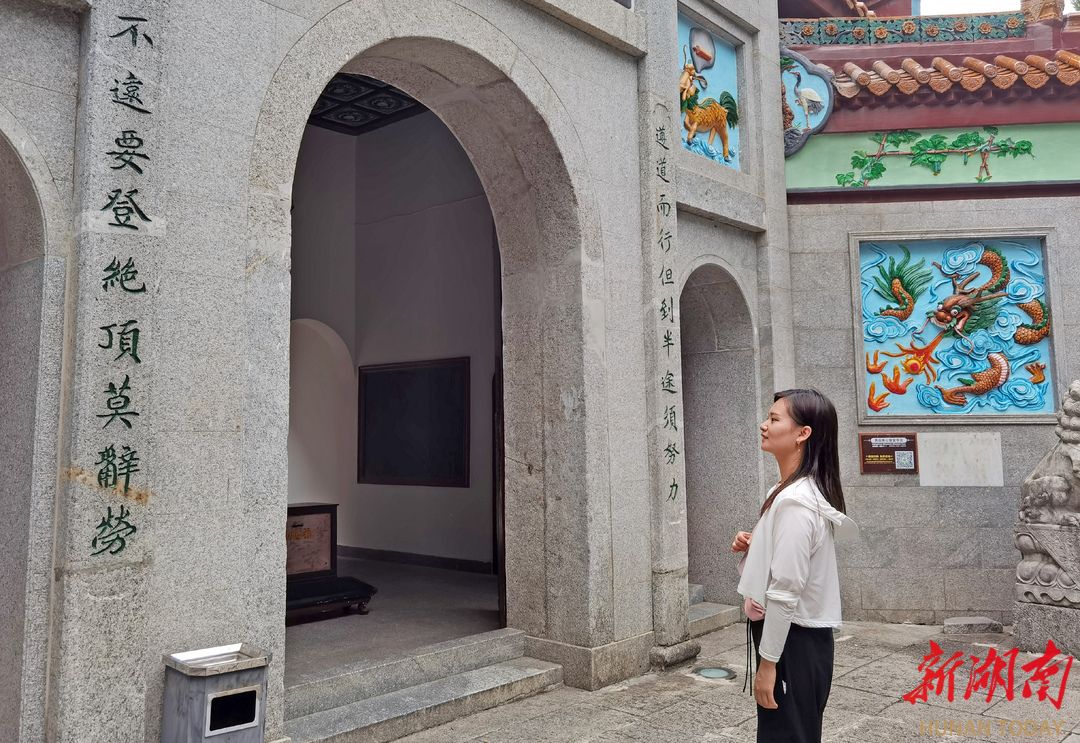 (記者在玄都觀山門前品讀楹聯。湖南日報全媒體記者 李健 攝)