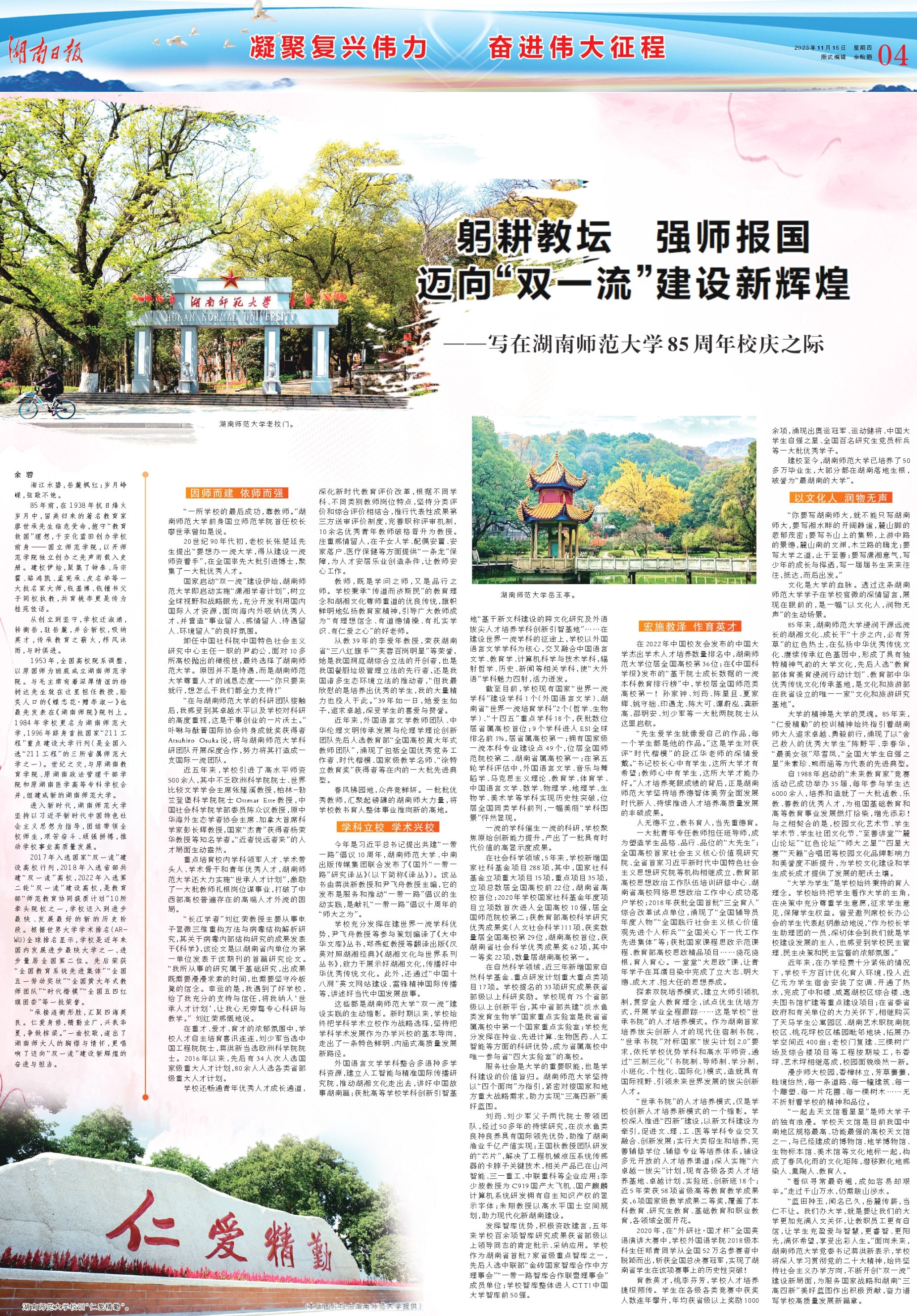 這些都是湖南師范大學“雙一流”建設實踐的生動縮影。新時期以來,學校始終把學科學術立校作為戰略選擇,堅持把學科學術發展作為辦學興校的基本導向,走出了一條特色鮮明、內涵式高質量發展新路徑。