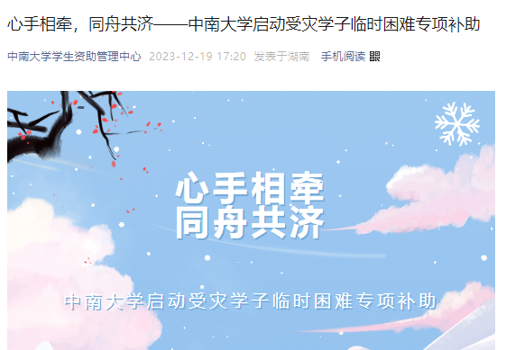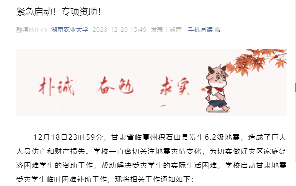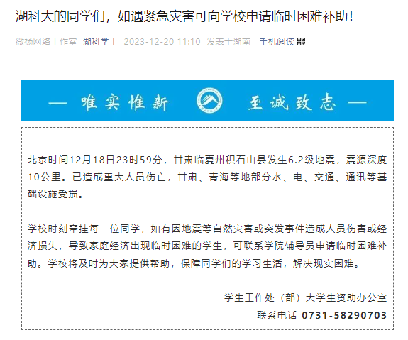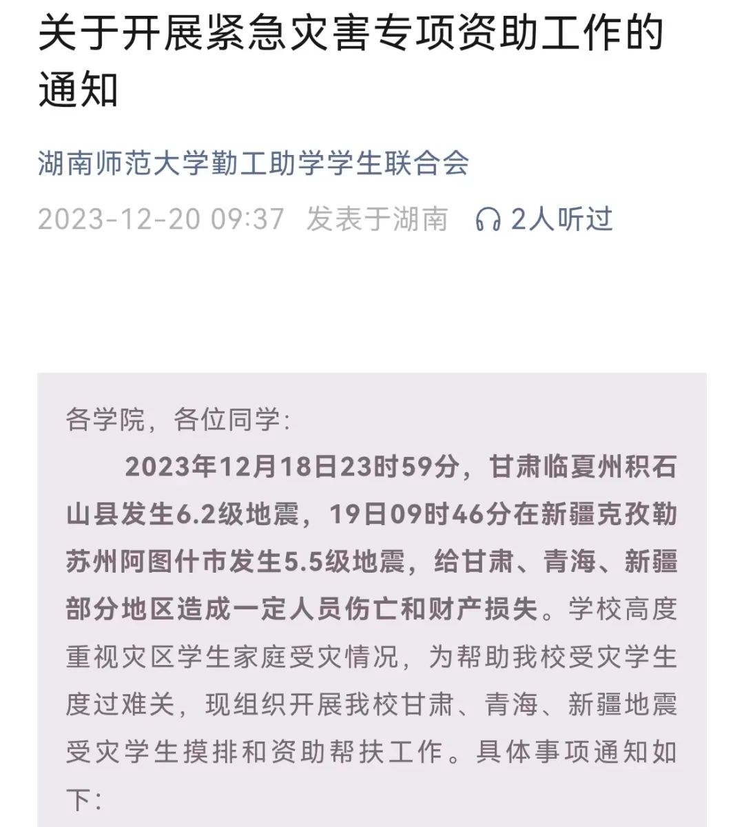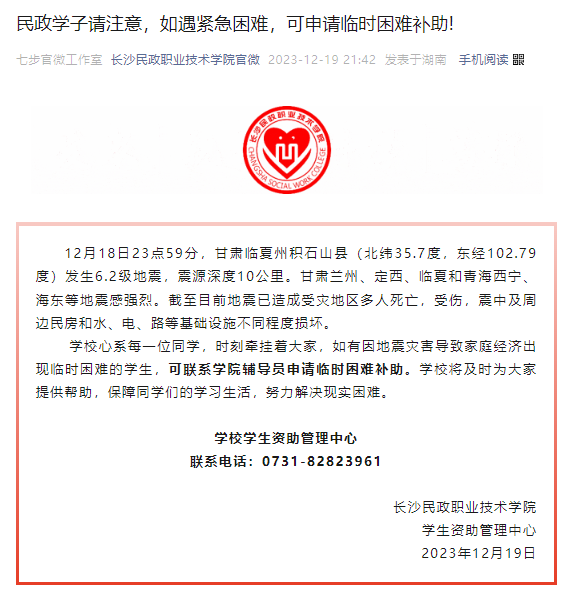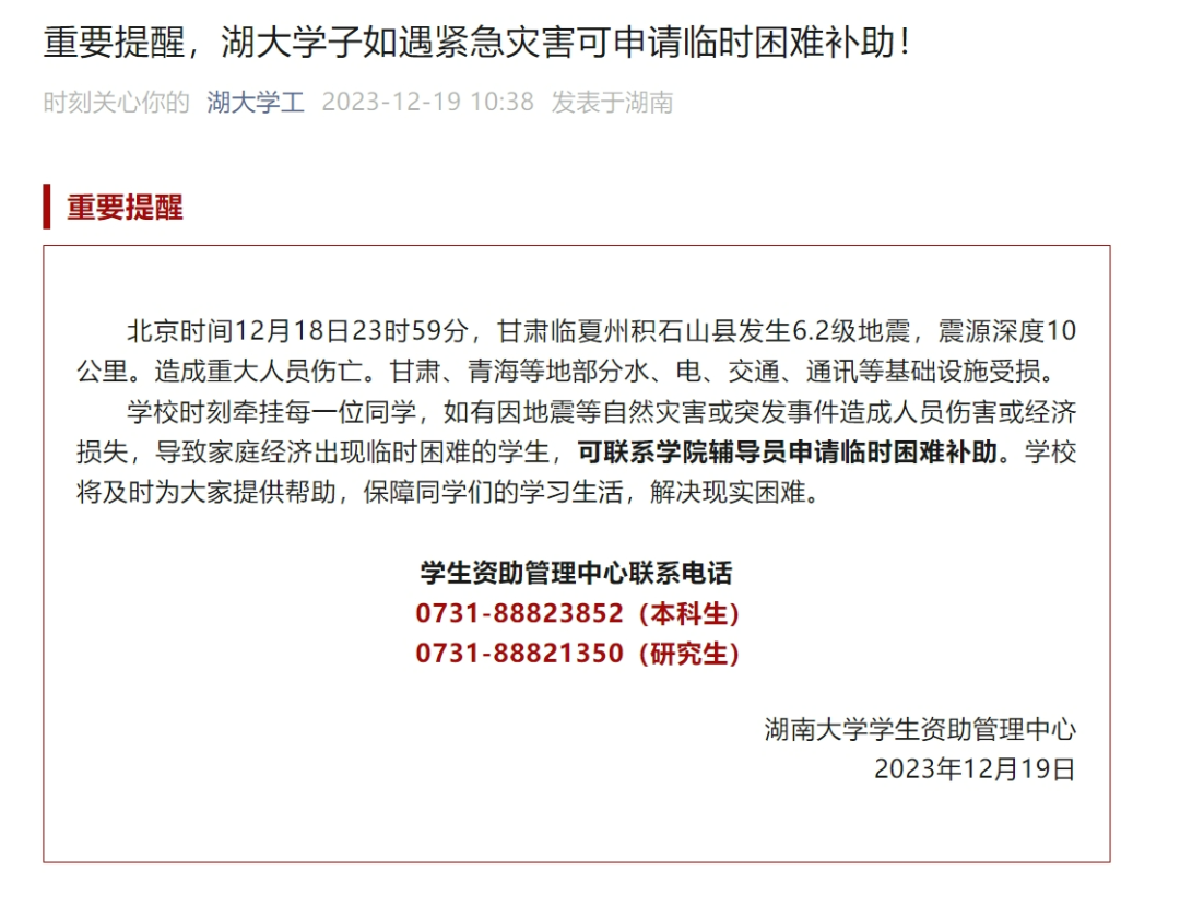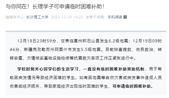 12月18日23時59分,甘肅臨夏州積石山縣發生6.2級地震,造成重大人員傷亡;12月19日09時46分,新疆克孜勒蘇州阿圖什市發生5.5級地震。突發災情牽動人心,湖南多所高校也發布緊急通知,為受災地區學生提供臨時困難補貼!