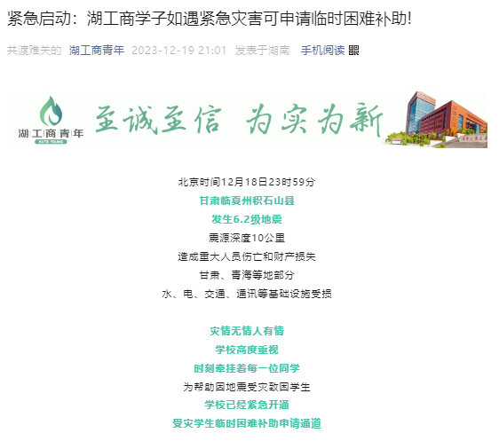 學校一直密切關注地震災情變化,為切實做好災區家庭經濟困難學生的資助工作,幫助解決受災學生的實際生活困難,學校啟動甘肅地震受災學生臨時困難補助工作。