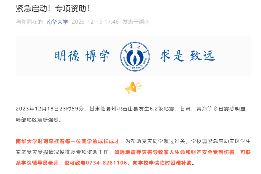 南華大學時刻牽掛著每一位同學的成長成才,為幫助受災同學渡過難關,學校現緊急啟動災區學生家庭受災受損情況摸排及專項資助工作,如遇地震等災害導致家人生命和財產安全受到傷害,可聯系學院輔導員老師,也可致電0734-8281106,向學校申請臨時困難補助。