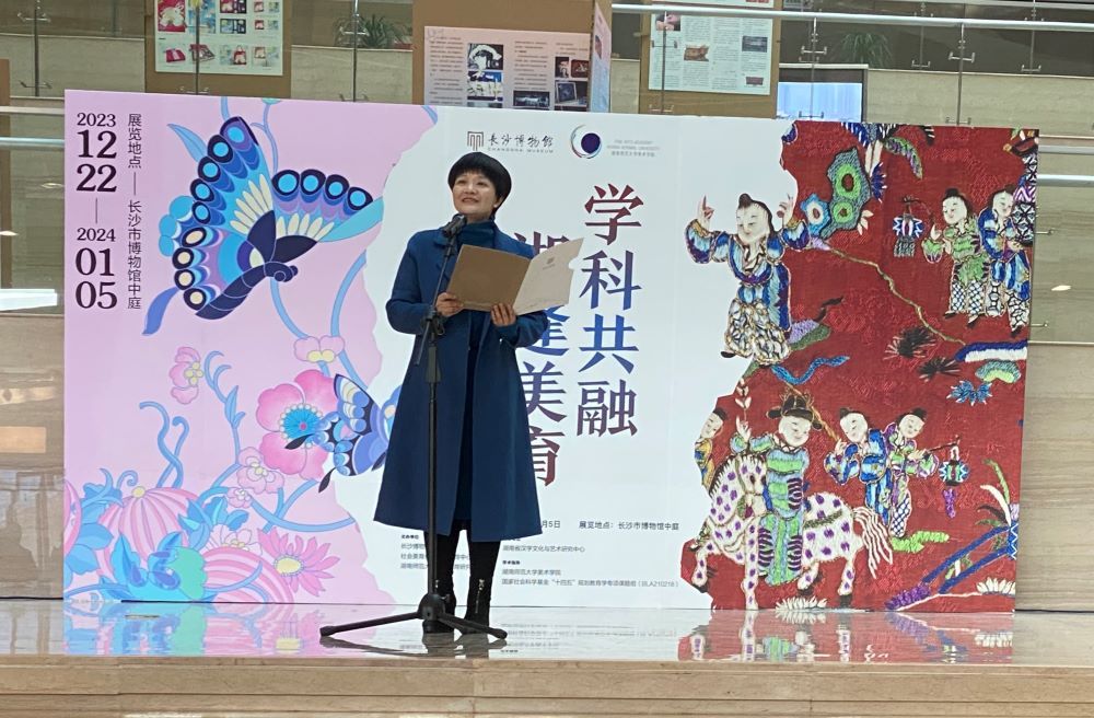 展覽現(xiàn)場,湖南省社科聯(lián)副主席賀建湘高度評價了館校美育聯(lián)動培養(yǎng)跨學科青年人才的社會服務(wù)價值,她肯定了青年創(chuàng)造力活化博物館湖湘美術(shù)展品、高校美術(shù)教育課程教學價值,創(chuàng)新優(yōu)質(zhì)美育資源建設(shè)路徑,開展社會美育優(yōu)質(zhì)服務(wù)的社會意義。