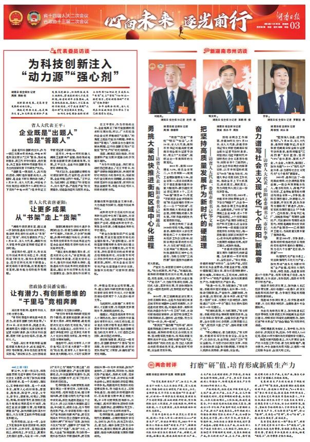 “湖南科教資源豐富,建議進一步加快推進高校科技成果轉化,推動更多優質科技成果從‘書架’走上‘貨架’,轉化為新質生產力。”1月24日,省人大代表、湖南科技大學黨委書記唐亞陽接受記者采訪時說。