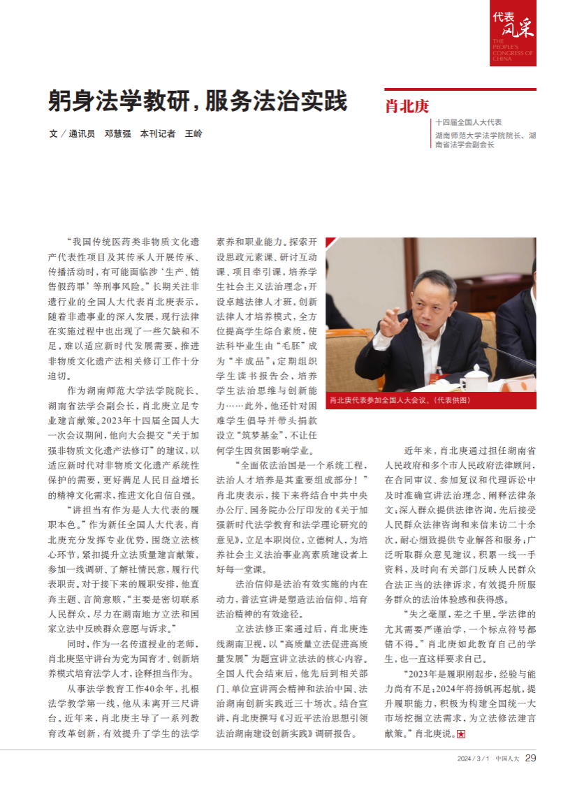 作為湖南師范大學(xué)法學(xué)院院長、湖南省法學(xué)會副會長,肖北庚立足專業(yè)建言獻(xiàn)策。2023年十四屆全國人大一次會議期間,他向大會提交“關(guān)于加 強非物質(zhì)文化遺產(chǎn)法修訂”的建議,以適應(yīng)新時代對非物質(zhì)文化遺產(chǎn)系統(tǒng)性保護(hù)的需要,更好滿足人民日益增長的精神文化需求,推進(jìn)文化自信自強。