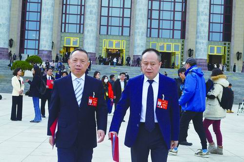 ①全國人大代表、湖南師范大學法學院院長肖北庚(左一)與全國人大代表、湖南中醫藥大學第一附屬醫院教授張滌。