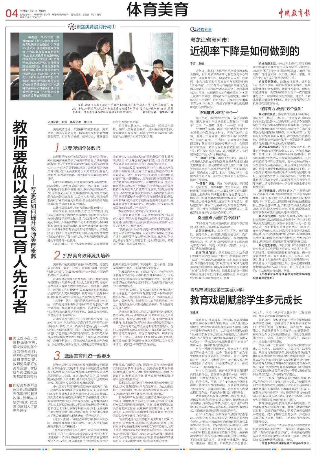 在專家看來,這里的教師是“全員”的概念,既包括藝術學科在內的各學科教師,也包括學校各個崗位的領導干部和工作人員。“美無處不在,美育也無處不在,學校教育的各個方面都有美育,教師職業本身就具有美育功能,教師便是最好的美育資源,學校各個崗位的從業者都是美育教師。美育教師這個稱謂不是藝術教師的專屬,而是學校全體教師的使命擔當。”郭聲健認為,以美育浸潤教師,是浸潤學校的每一位教師。