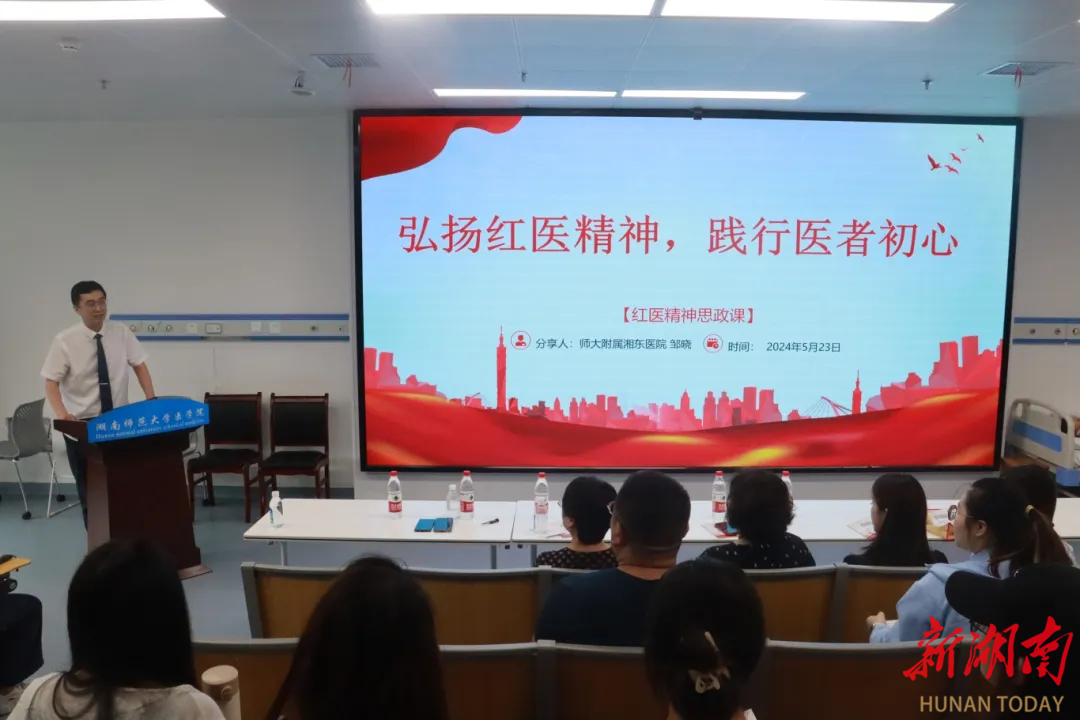 大眾衛生報·新湖南客戶端5月24日訊(通訊員 鐘雨芹 徐虹)為將紅色資源優勢轉化為育人優勢,發揚光榮傳統,傳承紅醫精神,不忘初心,提升醫學生醫德修養,讓紅醫精神在新時代依舊散發光芒。5月23日下午,湖南師范大學博士生導師、附屬湘東醫院黨委副書記、院長鄒曉應邀,以“弘揚紅醫精神,踐行醫者初心”為題,為湖南師范大學醫學院的學生上了一堂別開生面的思政課。湖南師范大學醫學院黨委書記鄢朝暉參加活動。