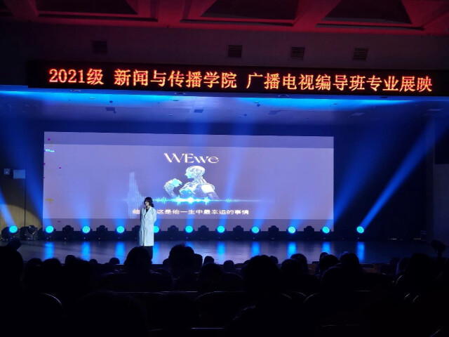 專業展映晚會創意十足,以建構完美AI數字人WEwe為核心線索,讓WE和me在時代、眾生和自己的故事里相互凝望、共同思考、永遠追問……晚會共展演了劇情片、紀錄片、微電影等15部影像作品。這些影像作品從選題策劃、拍攝制作、剪輯包裝到宣傳推廣,均由61名2021級編導專業的同學在4個月時間內獨立完成。它們聚焦文化交融,呈現傳統非遺,書寫社會現實,觀照人間百態,以影像的方式展現了編導學子對社會的關注以及自身的專業素養。同時,晚會現場還有歌舞、旗袍秀、舞臺劇等表演形式,與VCR形成多時空多場景的互動,全方位展現了同學們的能力、實力與魅力。
