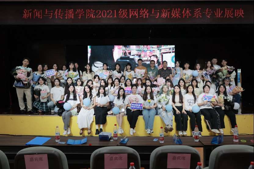 匯游,從五湖四海而來;洄游,往新的領域進發。專業展映晚會以“洄游”為主題,講述了2021級網絡與新媒體專業的50名同學攜著夢想匯集在一起,又帶著各自的希望洄游到屬于自己的那片湛藍海域的故事。晚會分“洄游”“匯游”“會友”“再見,再洄游”四個篇章進行作品展演,并結合歌舞、抽獎等活動為現場觀眾帶來了一場絕佳的視聽盛宴,全方位展現了網絡與新媒體專業學生情技糅合的專業素養。而且,新媒體學子們發揮專業特長,在此次晚會前期準備中積極開展融媒體運營,以微信公眾號、微博、小紅書等搭建新媒體矩陣,全面策劃宣傳,受到廣泛關注;同時,在展映中通過視頻號等平臺進行同步直播,獲得數千人次觀看。