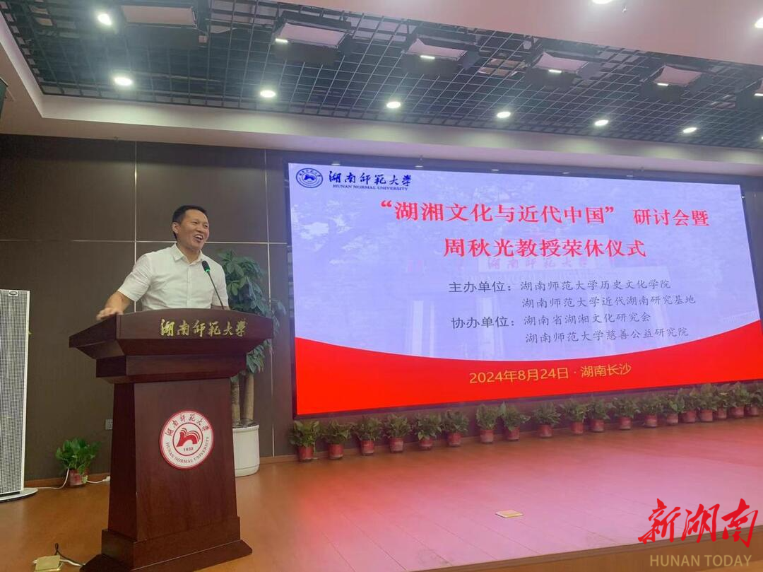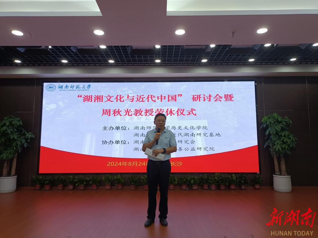 在會上,湖南師范大學劉懷德副校長致辭,他指出“周秋光教授是湖湘文化研究領域的杰出代表、領軍人物,他以嚴謹的治學態度、深厚的學術造詣和不懈的探索精神,為湖湘文化的傳承和發展做出了不可磨滅的貢獻,他的研究成果不僅豐富了我們對湖湘文化的理解,更為我們提供了許多寶貴的啟示。”湖南師范大學歷史文化學院黨委書記孔春輝在熱情洋溢的發言中,認為“在周秋光教授的引領下,湖湘文化研究人才輩出,桃李芬芳,教澤綿長,成果豐碩,成績斐然”。